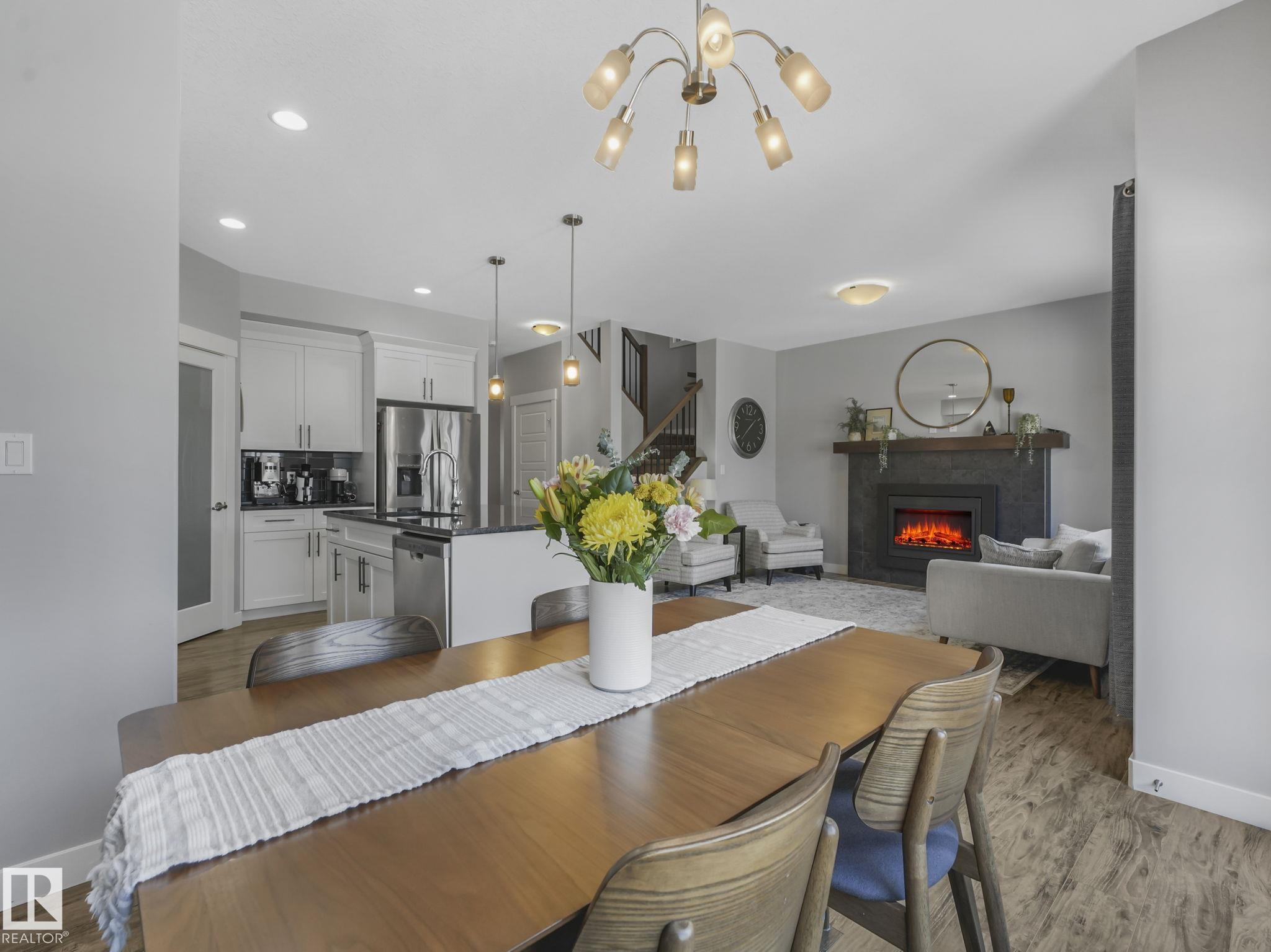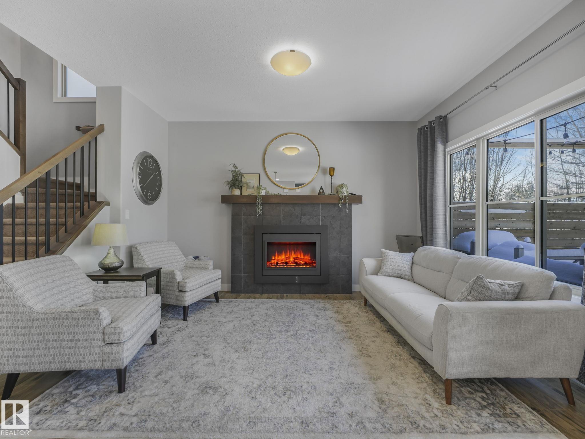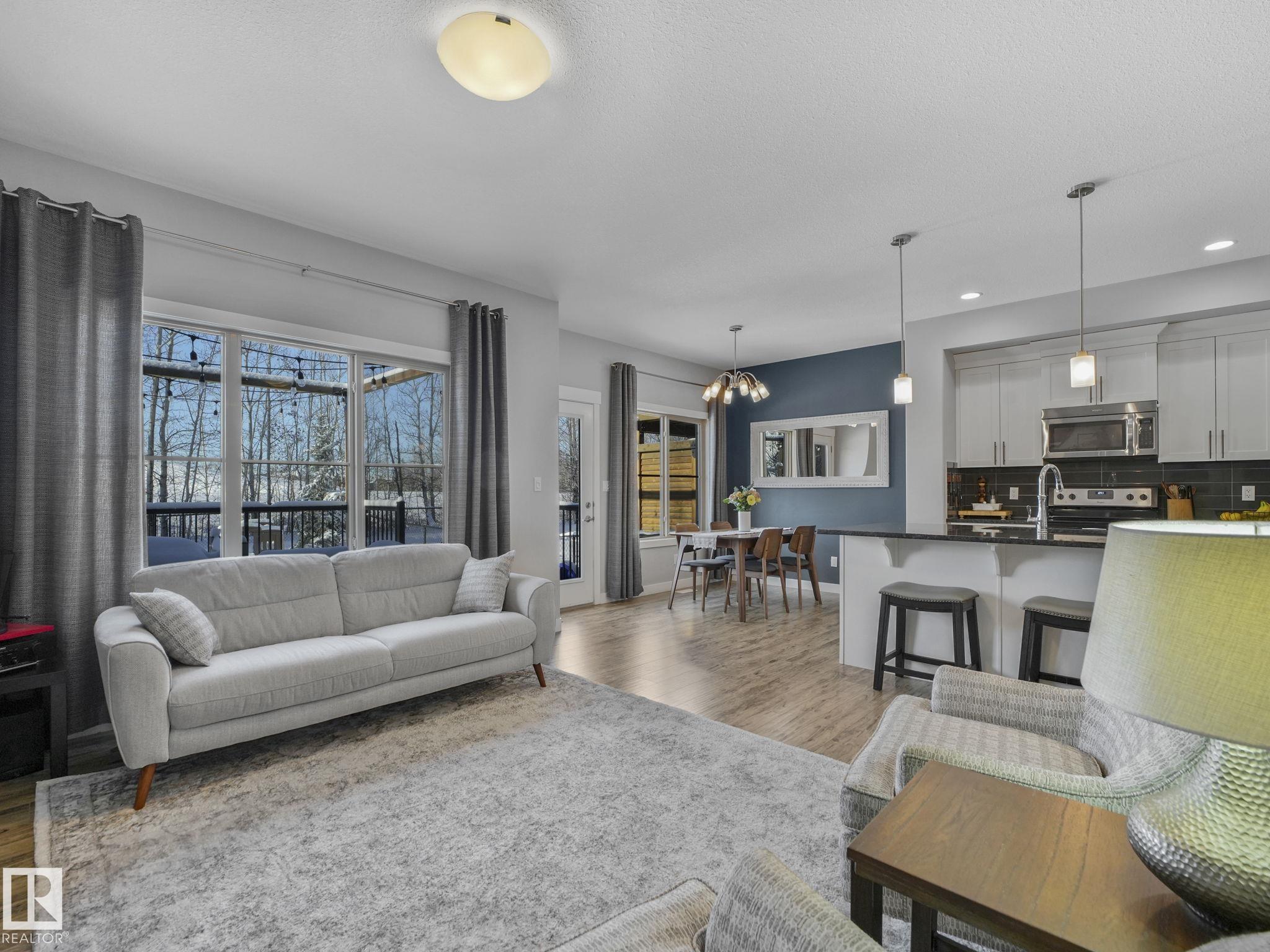This lovely 1834 sq. ft. home is backing onto the 60 acre Jubilee Park with walking trails, playground and spray park right out your gate and all tucked into a quiet side street. The large west facing deck with a pergola and a fenced yard is enhanced by mature trees along the back fence ensuring your privacy. The open concept design on the main floor features quartz countertops in the kitchen, a dining space and a lovely gas fireplace in the living room all enhanced by beautiful triple pane west facing windows and air conditioned comfort. Upstairs features a generous primary suite with 3 pc. ensuite and large walk in closet, a large loft/bonus room 2 additional bedrooms and laundry. You are within easy walking distance to the Prescott k-9 school and a child care center. The attached double garage has parking for 2 extra vehicles on the parking pad. The partly finished basement offers an extra living area and is roughed in for plumbing. This great location is with easy access to Highways 16 and 16a.