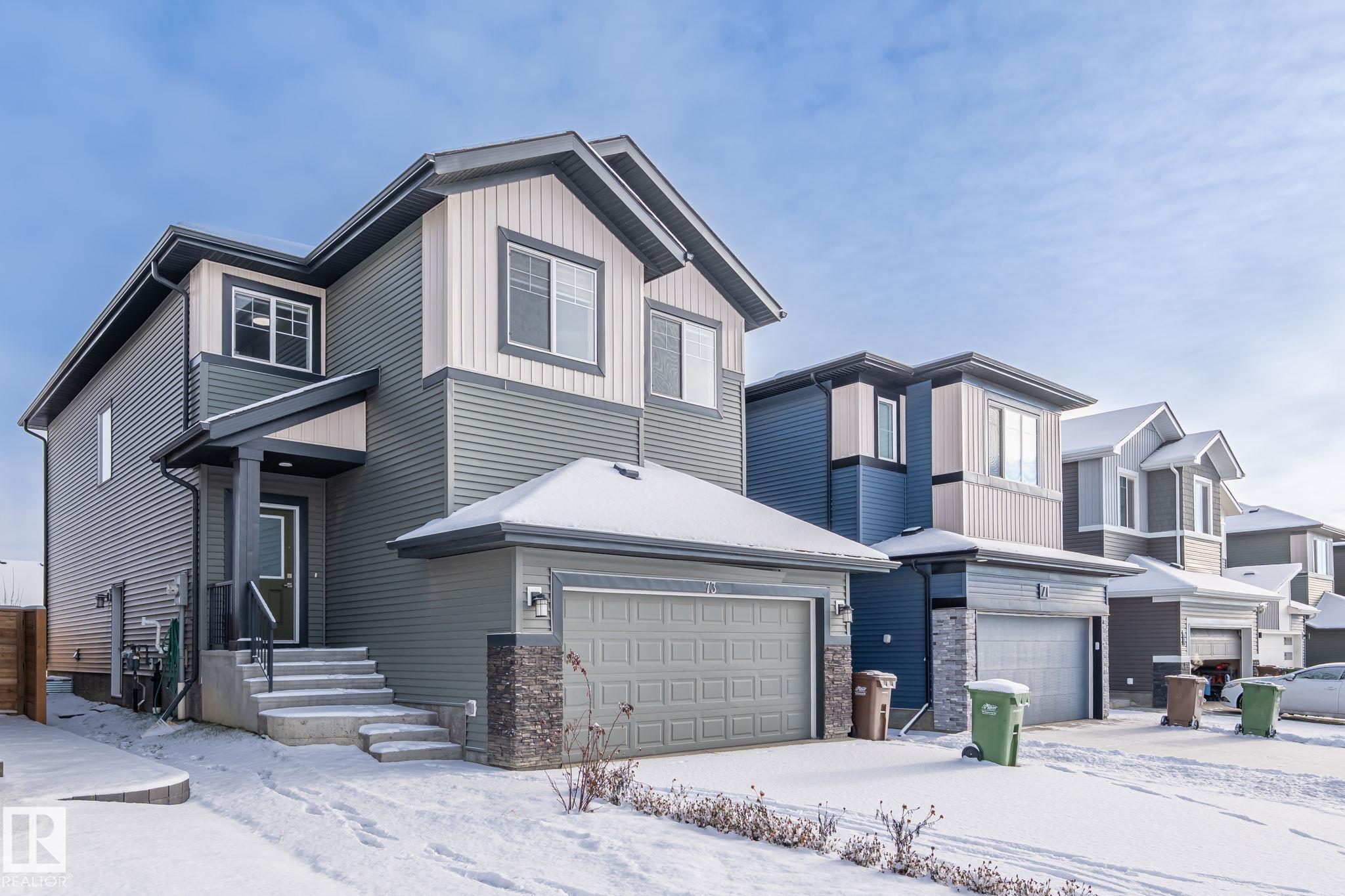 SHOWS 10/10 . 2379 SQ FT 4 BED 3 FULL BATH , 3 LIVING , 2 KITCHEN, SEPERATE SIDE ENTERANCE to 9 ft BASEMENT,FULLY LANDSCAPED . Welcome to Riverside community! This stunning 2-year-old home by Parkwood Master Builder offers 4 spacious bedrooms upstairs, 3 full baths, and 2 main floor living area perfect for family living and entertaining. The open-concept kitchen features modern finishes plus a spice kitchen for added convenience. A separate side entrance to 9 feet basement offers potential for a future suite. Enjoy an attached double garage with floor drain and a beautifully designed layout with room to grow. Located steps from Lois Hole Provincial Park, Red Willow Trails, and Big Lake, you'll love the natural beauty that surrounds you. Quick access to Ray Gibbon Dr. and Henday makes commuting a breeze. This move-in ready gem is waiting for its new owners--don't miss it!